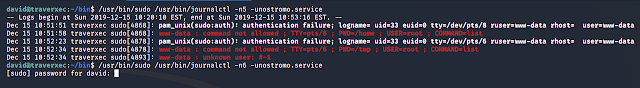 Note that you can only use exactly the command "/usr/bin/sudo /usr/bin/journalctl -n5 -unostromo.service" to run with sudo privilege without a password in this box.